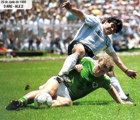 Packendes Duell zwischen Hans-Peter Briegel und Diego Maradona (WM-Finale in Mexiko, 29. Juni 1986)