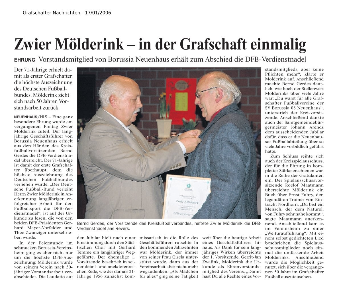 Vor nunmehr 20 Jahren, am 13. Januar 2006, hat der SV Borussia 08 Neuenhaus das Glück, in seinem Vereinsheim eine ganz besondere Ehrung ausrichten zu dürfen: Der Deutsche Fußball-Bund (DFB) verleiht dem langjährigen Borussia-Vorstandsmitglied Zwier Mölderink – als erstem Grafschafter überhaupt! – die höchste Auszeichnung, die er zu vergeben hat, die DFB-Verdienstnadel.
